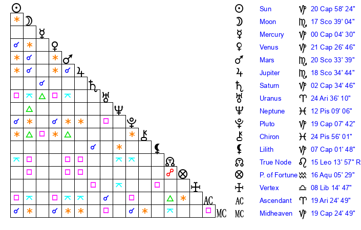 | Pluto | 19 Capricorn 8 | 3 Aquarius 2 | 19 Capricorn 24 |