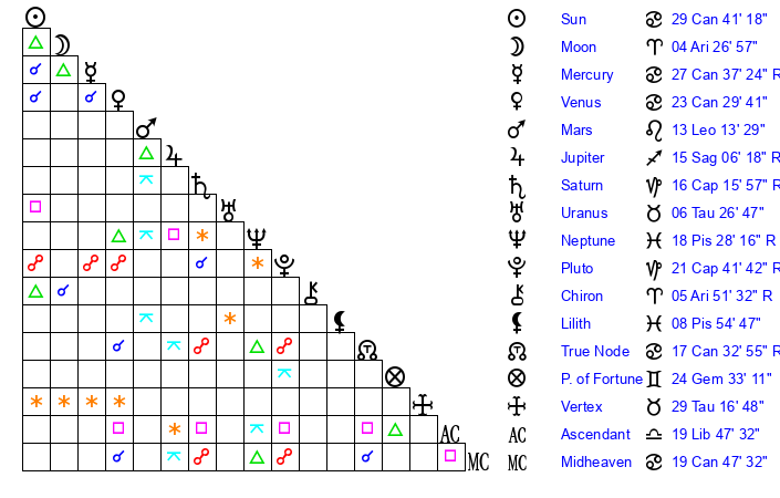 | Venus | 22 Cancer 52 | 19 Gemini 47 | 0 Leo 15 |