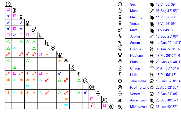| Sun | 12 Virgo 26 | 12 Virgo 57 | 18 Virgo 15 |