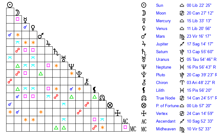 | Moon | 14 Cancer 21 | 16 Libra 39 | 12 Libra 56 |