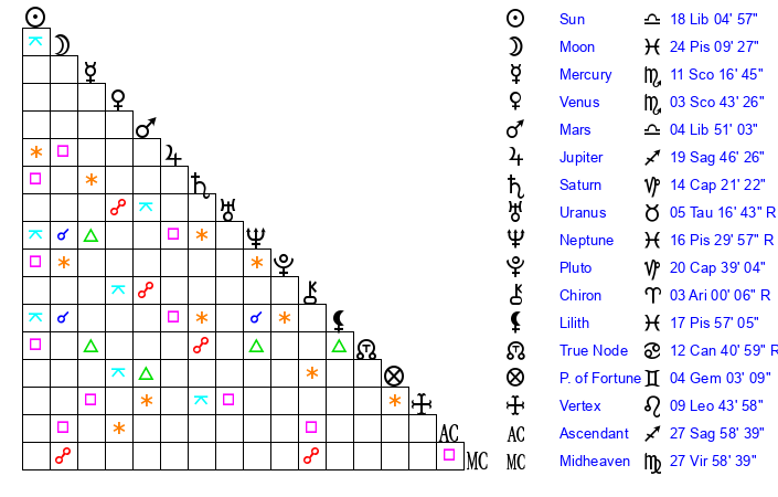 | Sun | 17 Libra 39 | 18 Libra 12 | 23 Libra 36 |