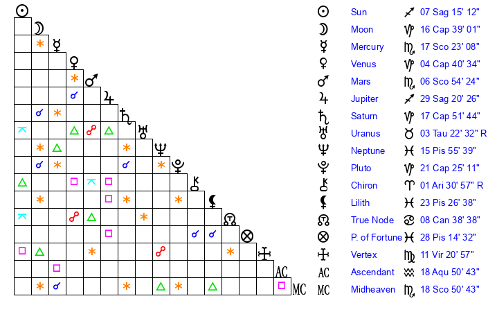 | Saturn | 17 Capricorn 54 | 25 Pisces 3 | 18 Capricorn 30 |