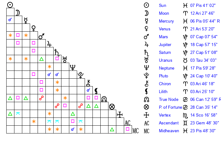 | Sun | 7 Pisces 7 | 7 Pisces 54 | 12 Pisces 8 |