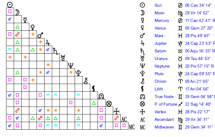 | Moon | 21 Virgo 54 | 0 Leo 14 | 3 Sagittarius 0 |