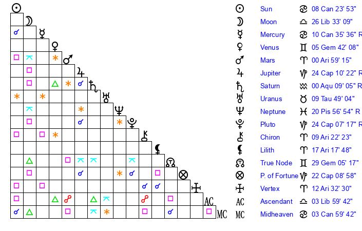 | Mars | 0 Aries 43 | 6 Virgo 46 | 3 Aries 42 |