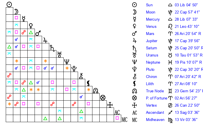| Moon | 17 Capricorn 17 | 10 Scorpio 43 | 19 Pisces 44 |