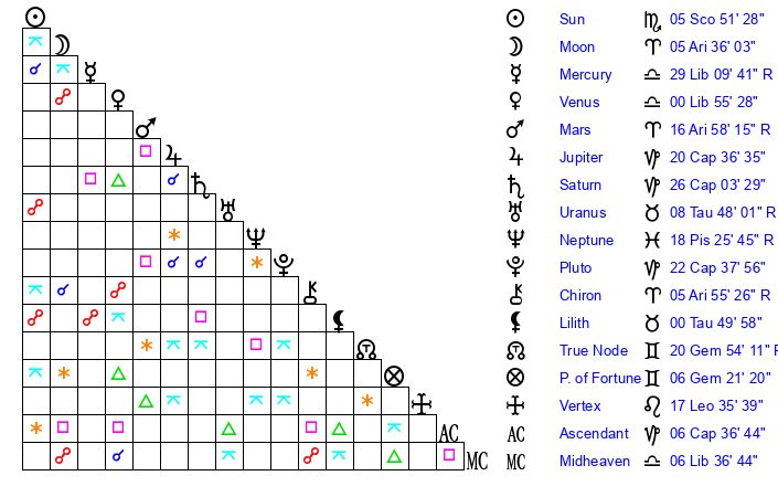 | Mars | 17 Aries 6 | 24 Scorpio 49 | 16 Aries 10 |
