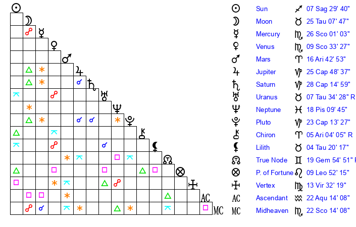 | Moon | 25 Taurus 12 | 19 Pisces 26 | 26 Cancer 36 |
