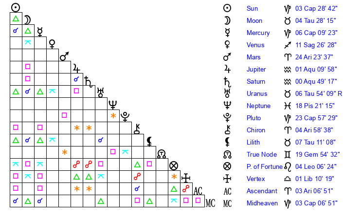 | Mars | 24 Aries 11 | 6 Capricorn 47 | 26 Aries 12 |