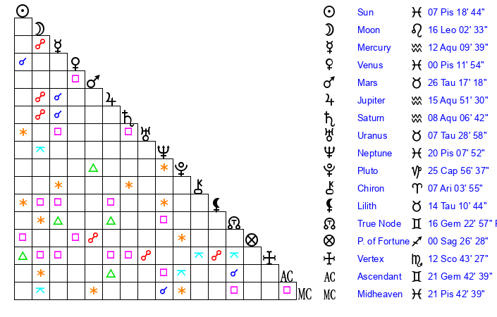 | Jupiter | 15 Aquarius 44 | 11 Gemini 59 | 16 Aquarius 39 |