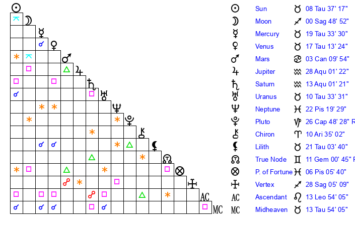 | Venus | 16 Taurus 42 | 28 Pisces 43 | 21 Taurus 37 |