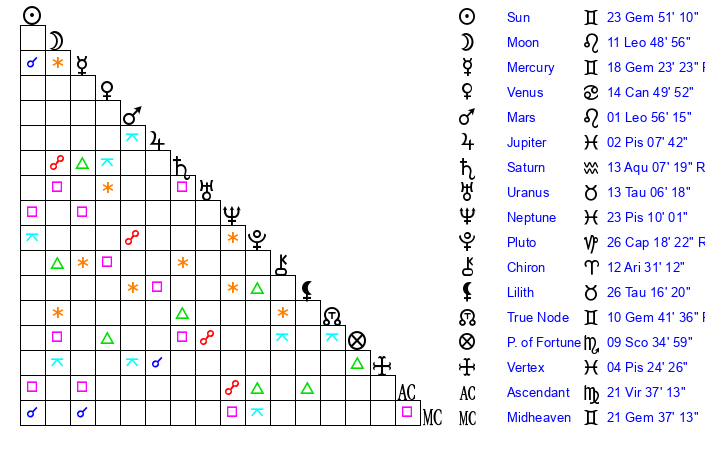| Mercury | 18 Gemini 36 | 10 Cancer 16 | 16 Gemini 54 |