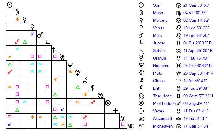 | Mercury | 2 Cancer 5 | 14 Leo 36 | 8 Cancer 39 |