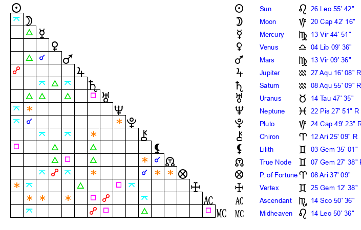| Mercury | 13 Virgo 1 | 7 Leo 59 | 19 Virgo 33 |