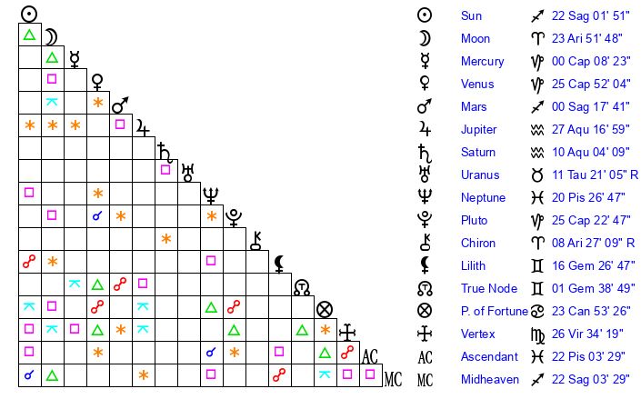 | Neptune | 20 Pisces 27 | 29 Pisces 22 | 20 Pisces 29 |