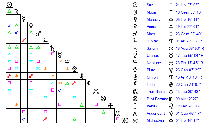 | Moon | 13 Gemini 5 | 27 Cancer 32 | 19 Cancer 1 |