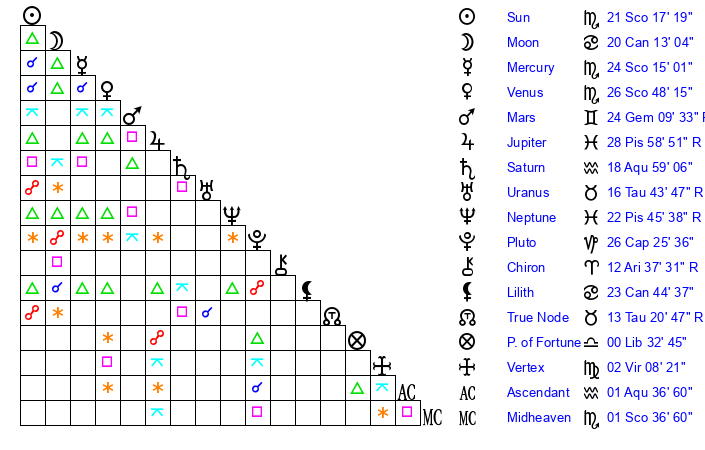 | Venus | 26 Scorpio 16 | 7 Scorpio 56 | 0 Sagittarius 2 |