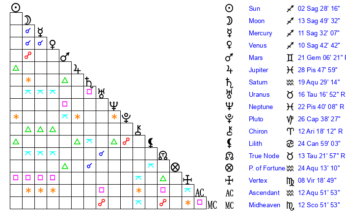 | Sun | 1 Sagittarius 57 | 2 Sagittarius 13 | 4 Sagittarius 59 |