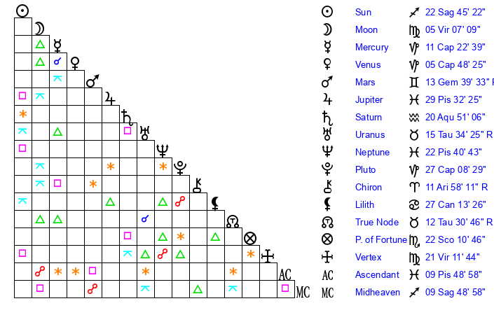 | Saturn | 20 Aquarius 48 | 25 Pisces 18 | 21 Aquarius 3 |