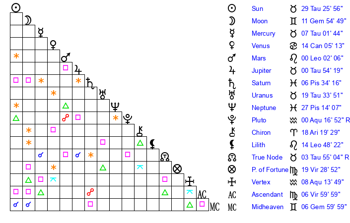 | Jupiter | 0 Taurus 47 | 25 Gemini 25 | 1 Taurus 14 |