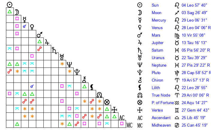 | Mercury | 29 Leo 6 | 11 Leo 43 | 1 Virgo 55 |
