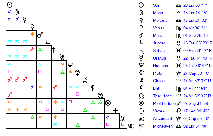 | Moon | 15 Libra 23 | 27 Cancer 32 | 10 Scorpio 18 |