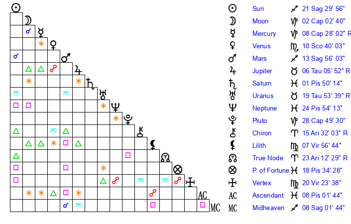 | Neptune | 24 Pisces 54 | 29 Pisces 22 | 24 Pisces 54 |