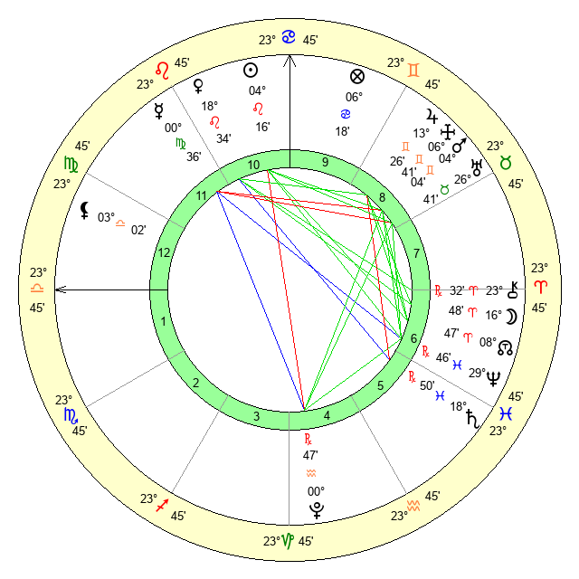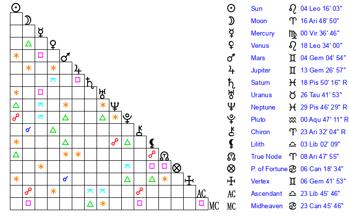| Moon | 9 Aries 16 | 22 Leo 0 | 23 Aries 31 |