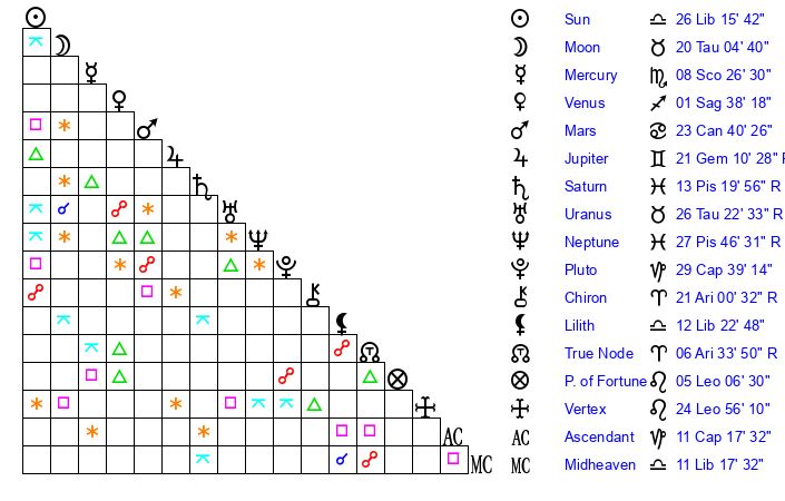 | Moon | 21 Taurus 32 | 1 Libra 8 | 6 Gemini 13 |