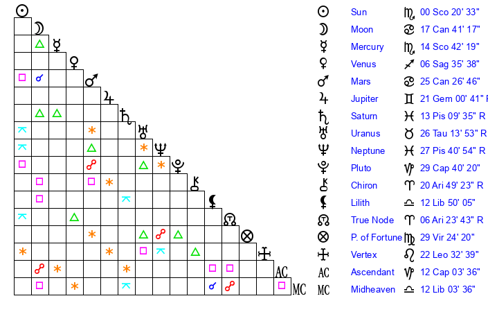 | Moon | 17 Cancer 44 | 19 Scorpio 15 | 0 Leo 40 |