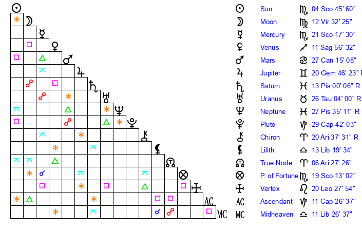 | Neptune | 27 Pisces 35 | 29 Pisces 52 | 27 Pisces 34 |