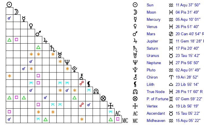 | Moon | 4 Pisces 26 | 4 Pisces 26 | 4 Pisces 26 |