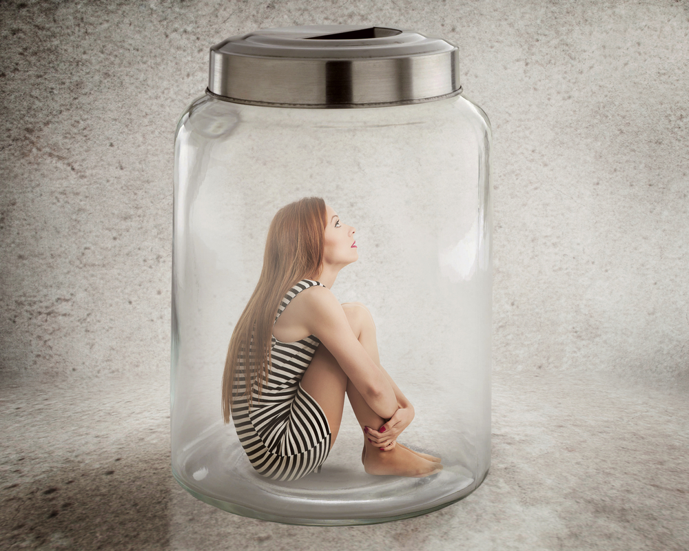 Young lonely woman sitting in glass jar